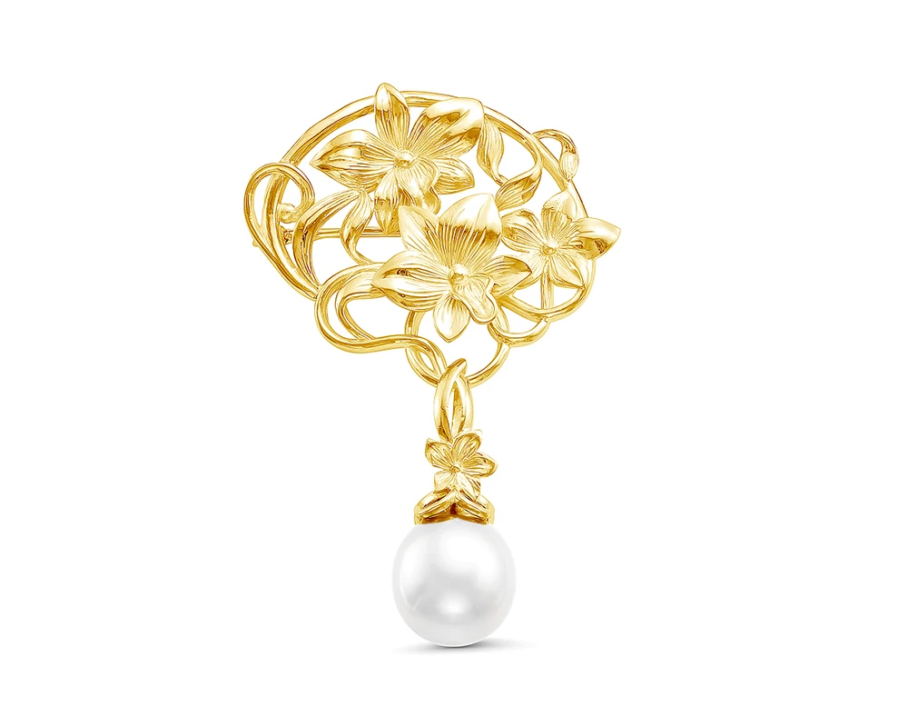 Эксклюзивная брошь выполнена из серебра 925 пробы с желтым покрытием и украшена морской жемчужиной Южных морей (Австралия). Размер броши —3 х 5 см.