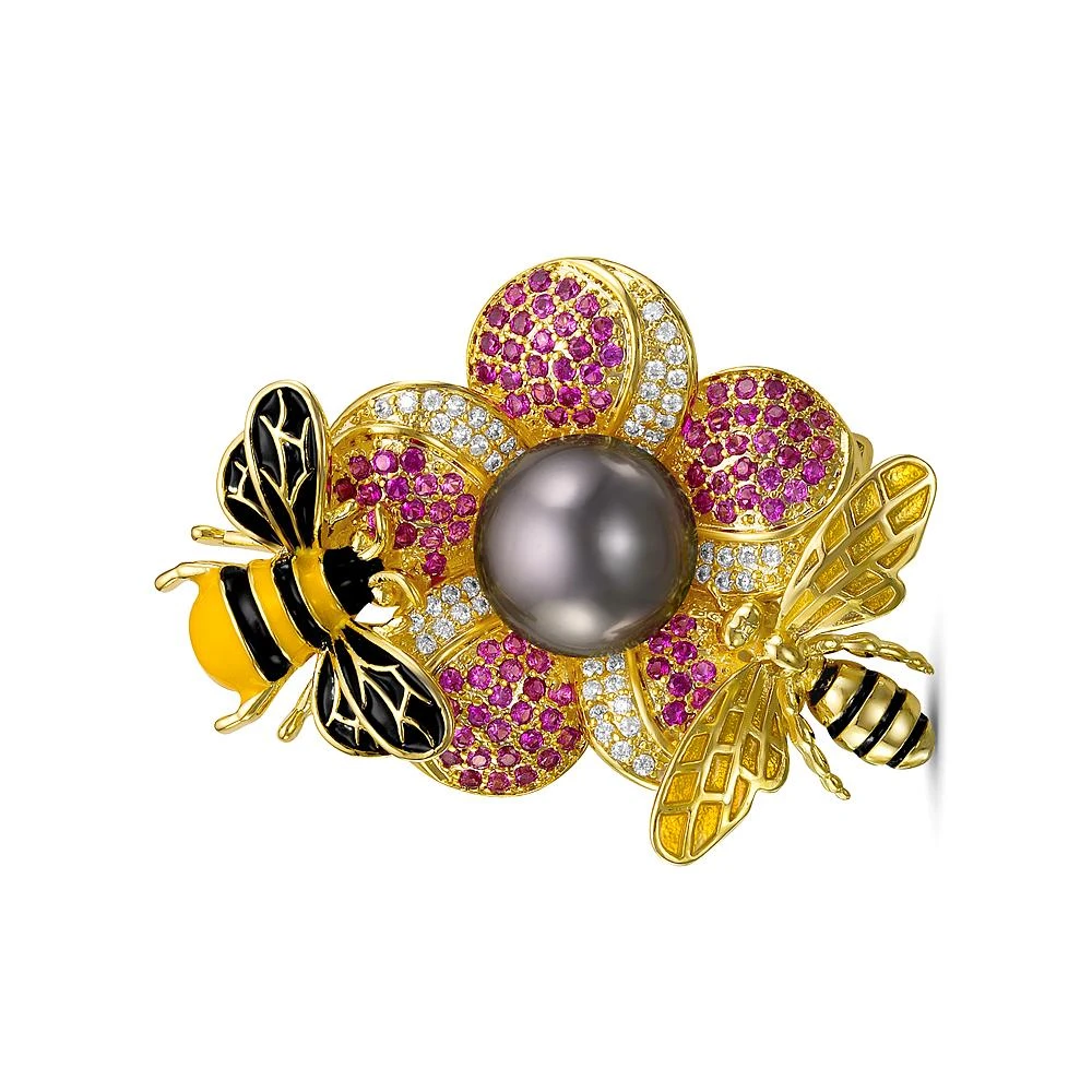 Брошь-кулон из сплава "Пчелки" с Таитянской жемчужиной 12-12,5 мм, (7194)