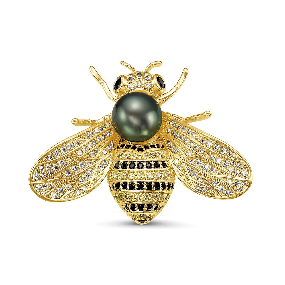 Брошь-кулон из ювелирного сплава покрыта желтым золотом и украшена черной морской Таитянской жемчужиной. Размер броши — 4 см.