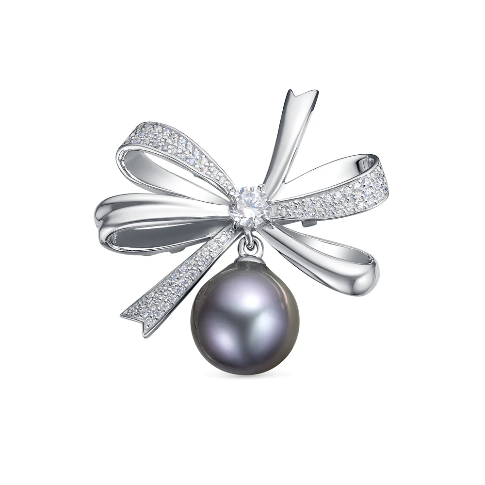 Брошь "Бант" с черной Таитянской морской жемчужиной 13-13,5 мм, (7190)