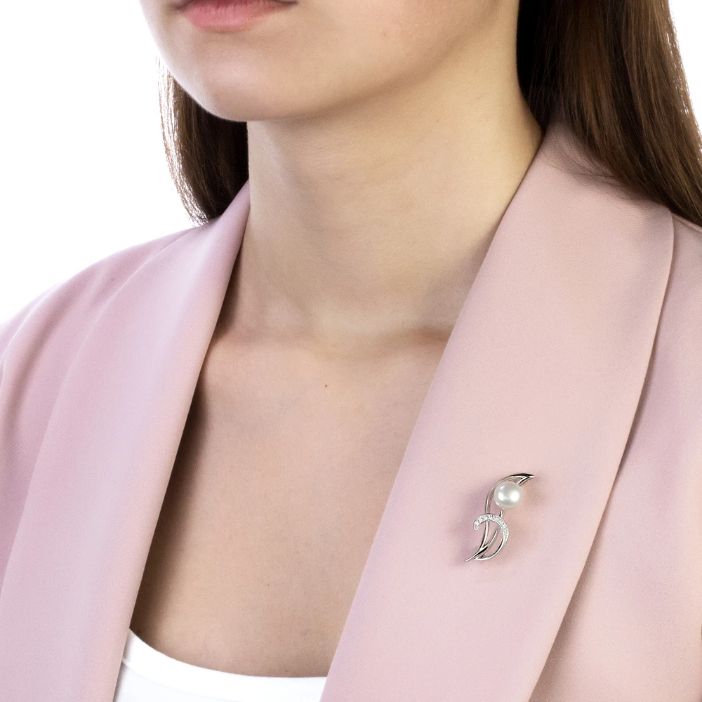 Брошь из серебра с белой речной жемчужиной 9,5-10 мм, (4321)