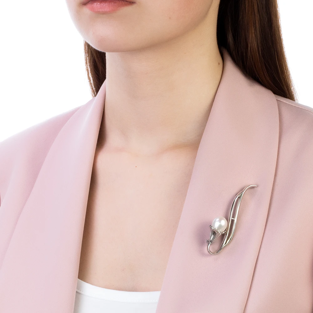 Брошь выполнена из серебра 925 пробы, украшена белой пресноводной жемчужиной рисообразной формы. Размер броши — 7 см.