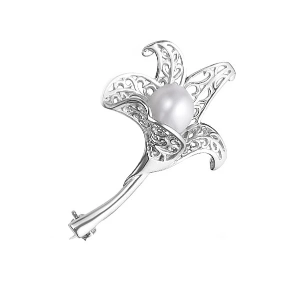 Брошь из серебра с белой каплевидной речной жемчужиной 7,5-8 мм, (4054)