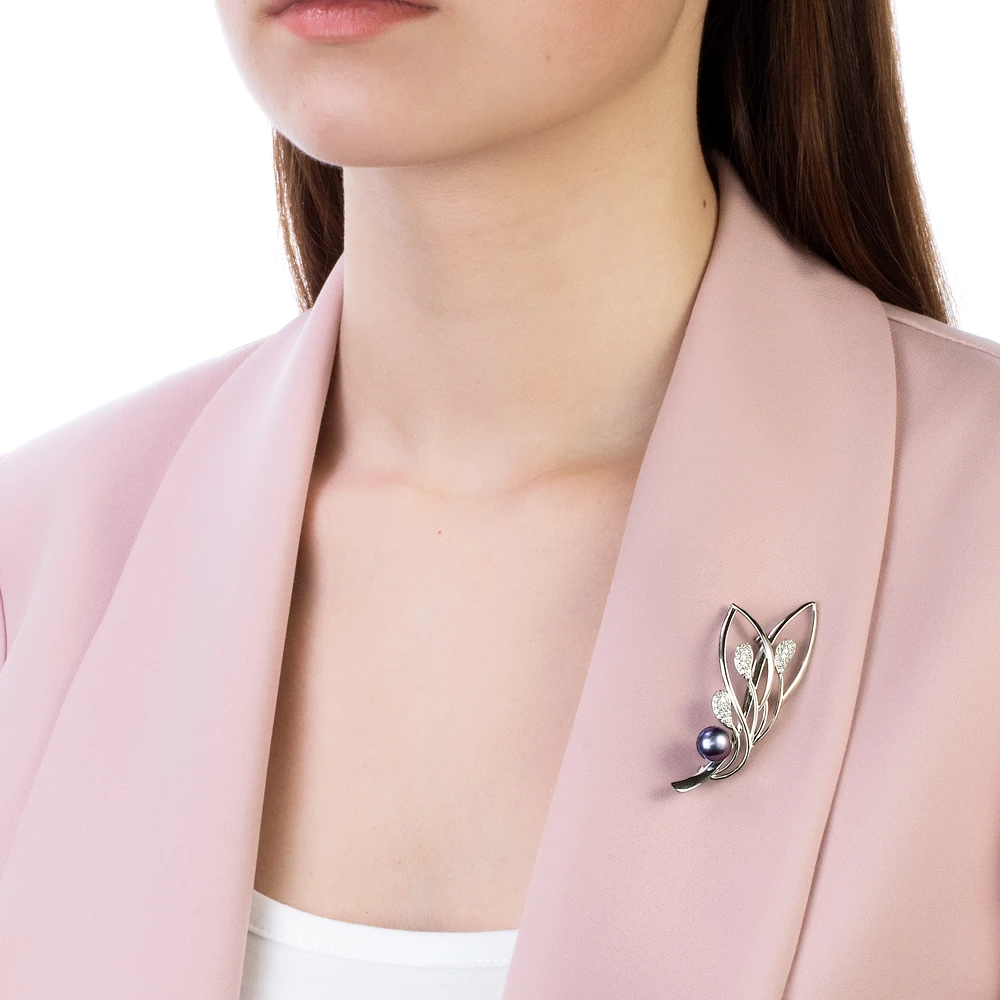 Брошь из серебра с черной речной жемчужиной 8,5-9 мм, (4411)