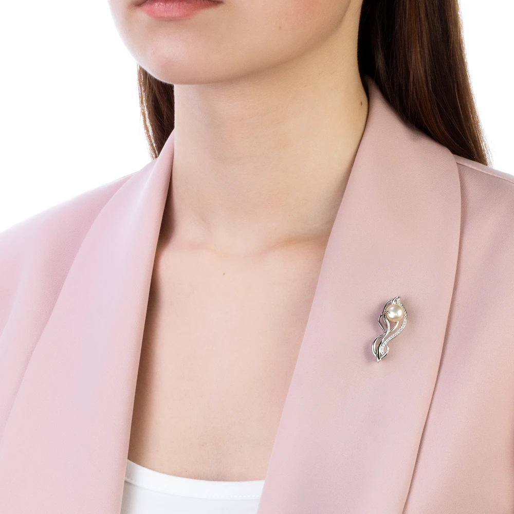 Брошь выполнена из серебра 925 пробы, украшена розовой пресноводной жемчужиной сплющенной формы. Размер броши — 3,5 см.