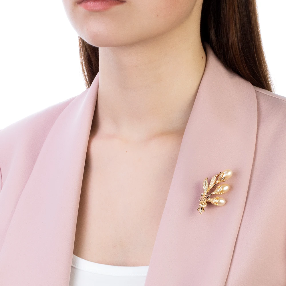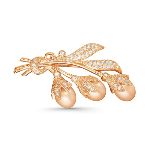 Брошь выполнена из серебра 925 пробы с красным золотым покрытием, украшена розовыми пресноводными жемчужинами. Размер броши - 4 см.
