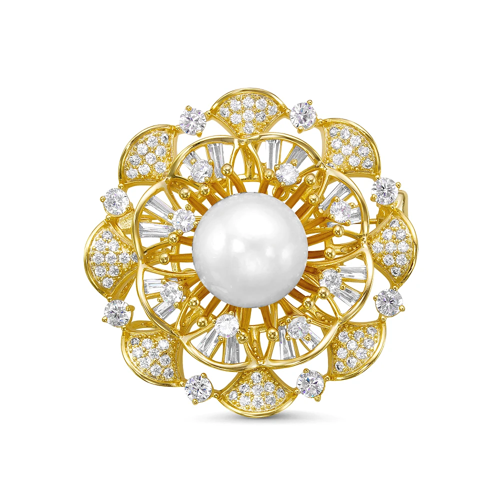 Брошь выполнена из высококачественного ювелирного сплава с золотым покрытием и украшена пресноводной белой жемчужиной.
