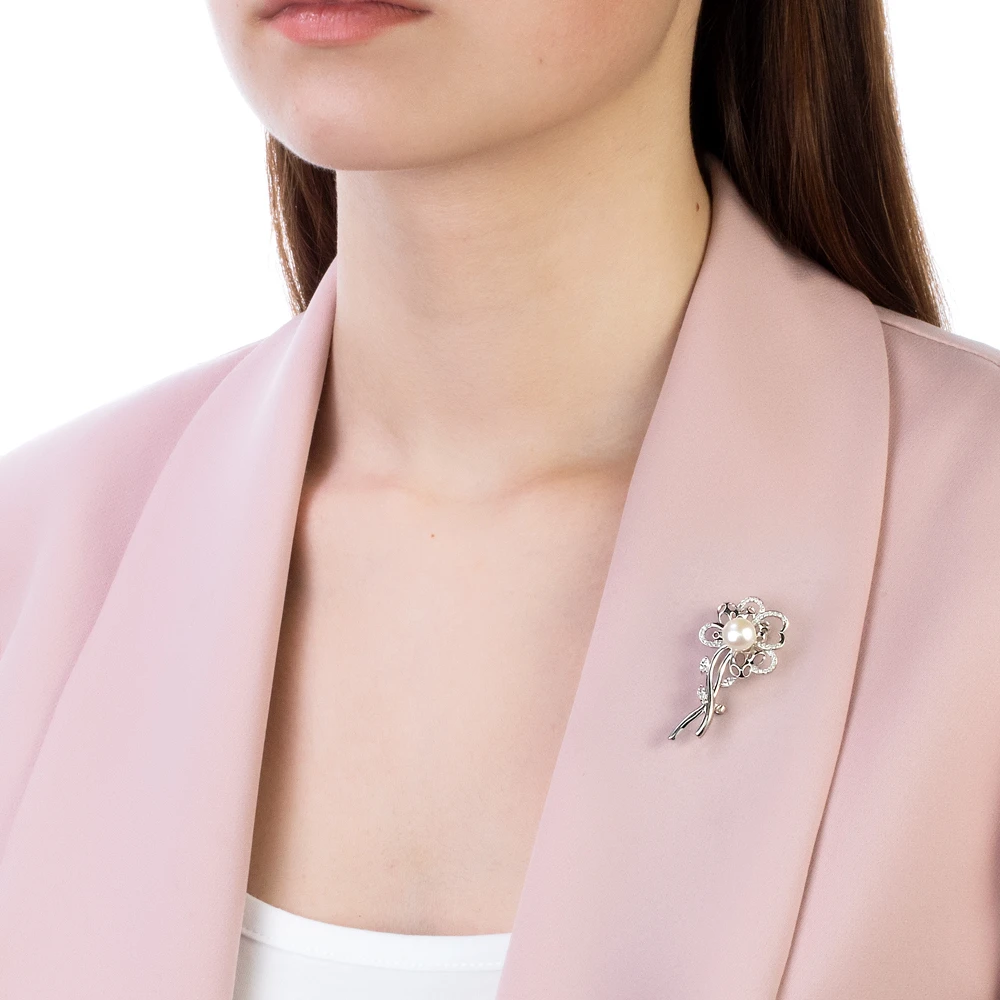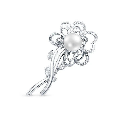 Брошь выполнена в форме цветка из серебра 925 пробы и украшена фианитами и речной жемчужиной белого цвета. Размер броши - 4,5 см.