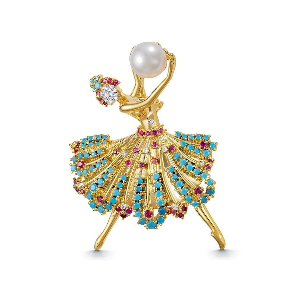 Брошь-кулон "Балерина" из сплава с белой речной жемчужиной 8,5-9 мм, (5776)
