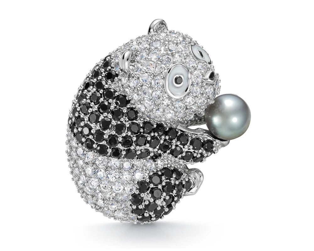 Брошь "Панда" из сплава с серебристой речной жемчужиной 7-7,5 мм, (5742)
