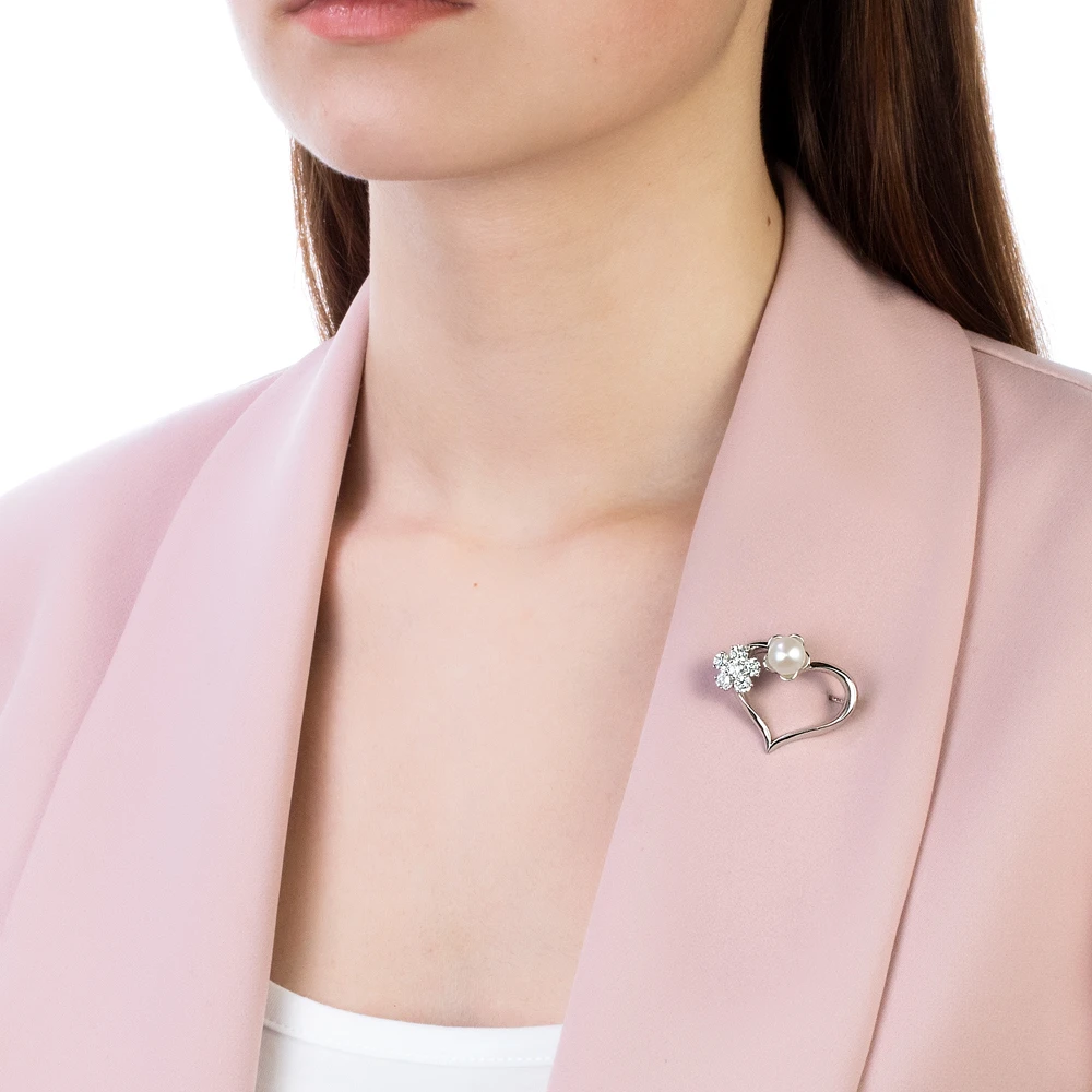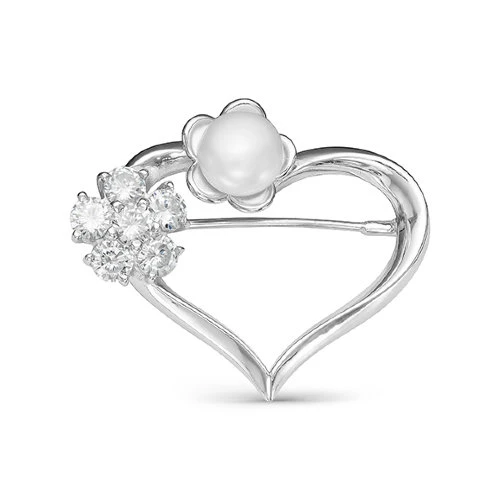 Брошь "Сердце" из серебра с белой речной жемчужиной 8,5-9 мм, (4416)