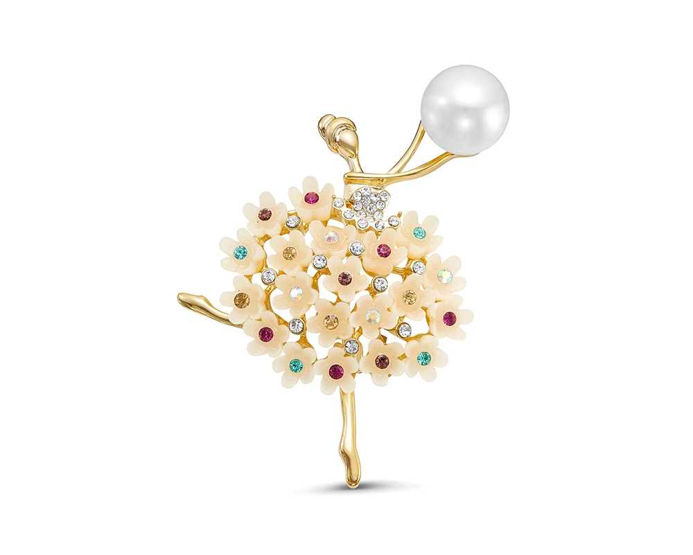 Брошь "Балерина" из сплава с белой речной жемчужиной 9,5-10 мм, (5739)