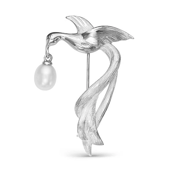 Брошь "Птица" из серебра с белой речной жемчужиной 7,5-8 мм, (1503)
