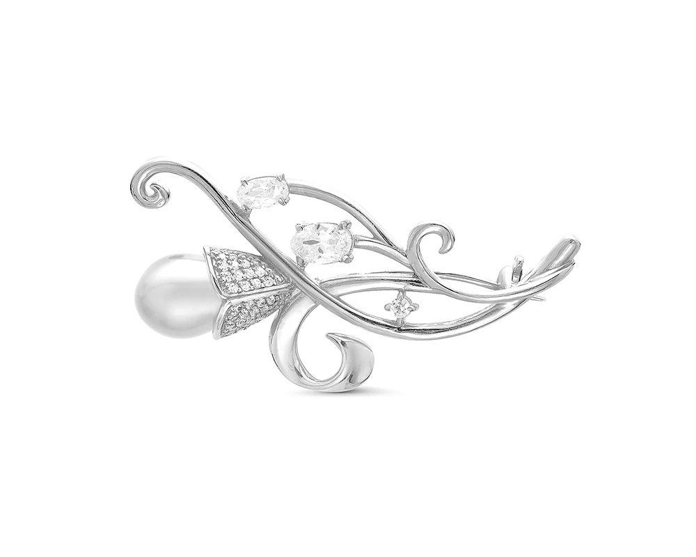 Брошь выполнена из серебра 925 пробы, украшена белой пресноводной жемчужиной и фианитами. Размер броши — 4,5 см.