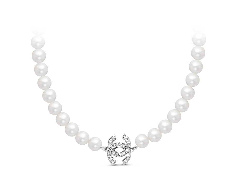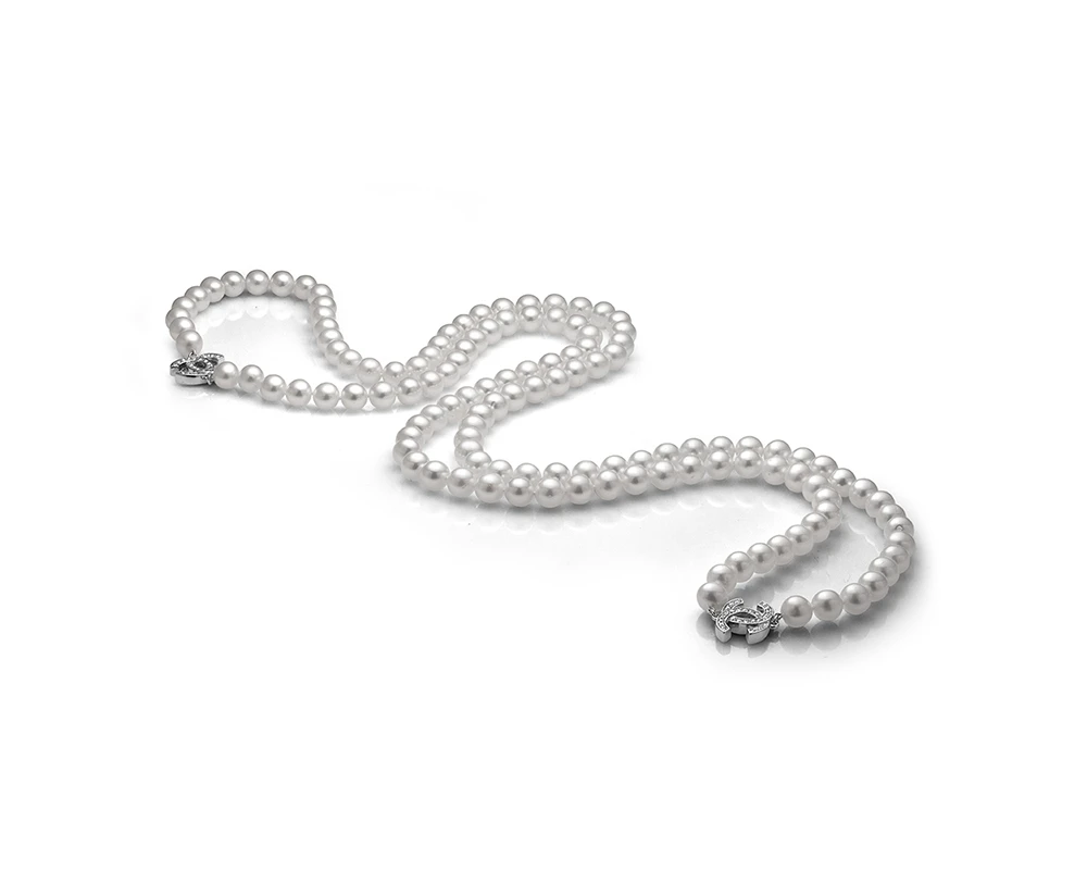 Стильные бусы собраны из белого жемчуга и украшены вставками из серебра 925 пробы с фианитами. Длина бус — 110 см.