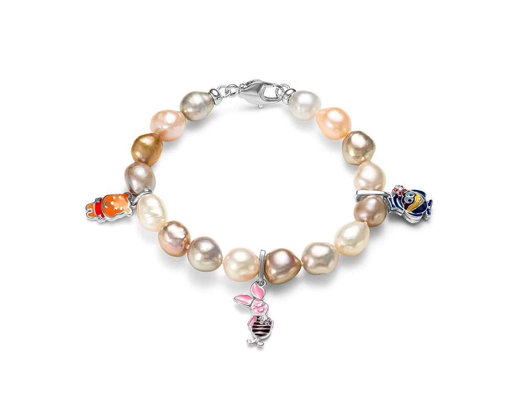 Стильный детский браслет из жемчуга барокко. Длина браслета — 17 см. Замок — сплав. Подвески из серебра 925 пробы с эмалью.