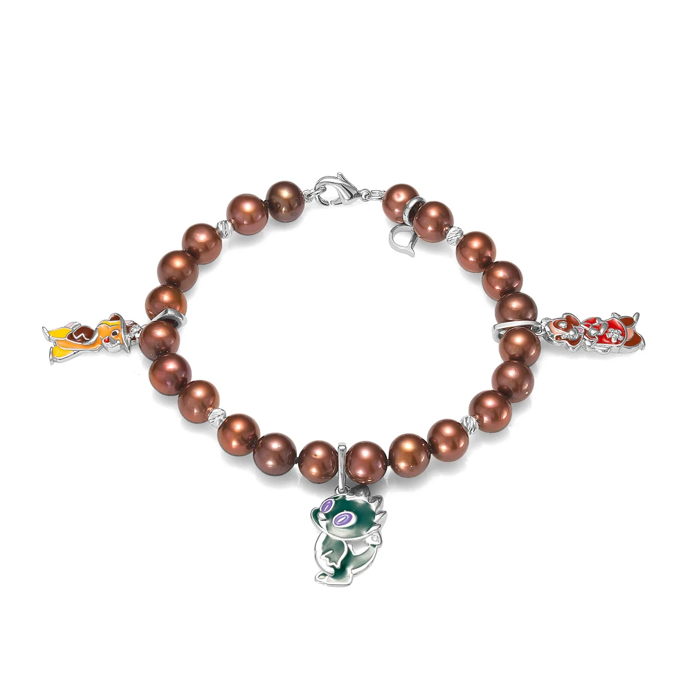 Стильный детский браслет из шоколадного жемчуга украшен кулонами из серебра с эмалью. Длина браслета — 17 см. Замок — сплав.