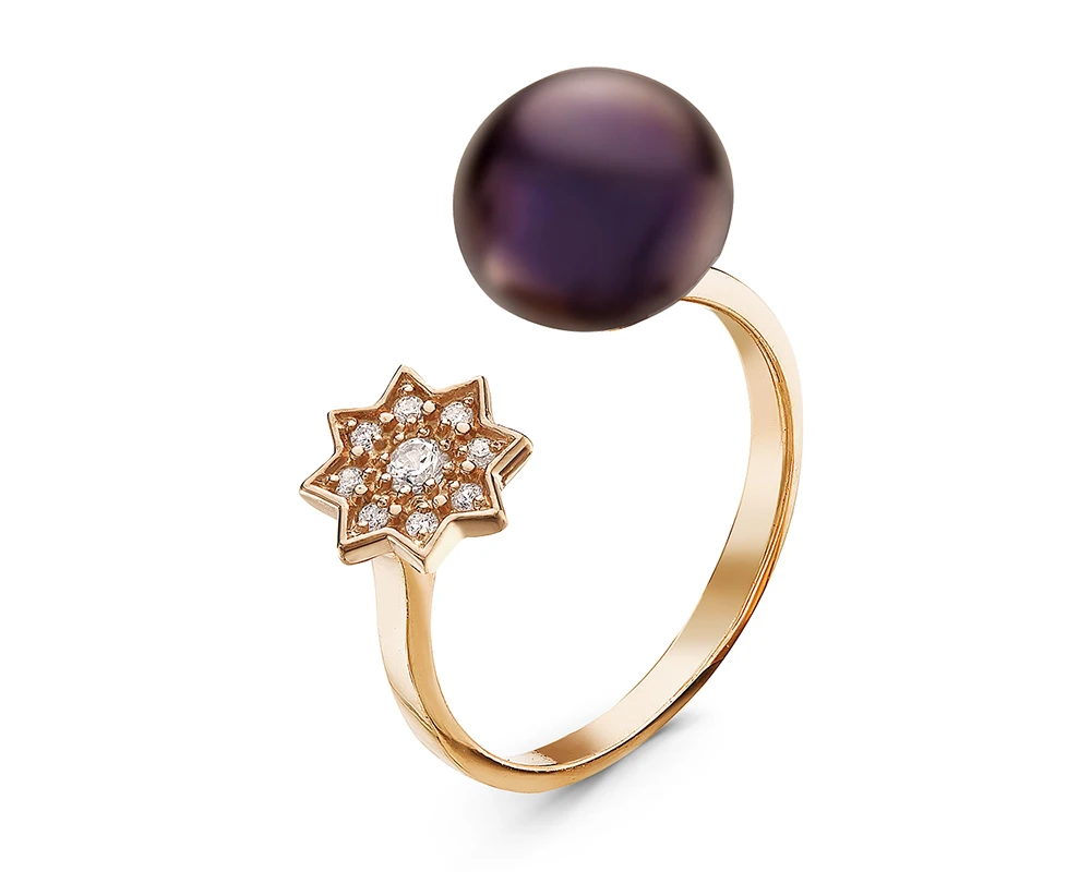 Кольцо выполнено из серебра 925 пробы с красным золотым покрытием, украшено фианитом и черной пресноводной жемчужиной в форме пуговица (сплющенная). Размер кольца — универсальный.