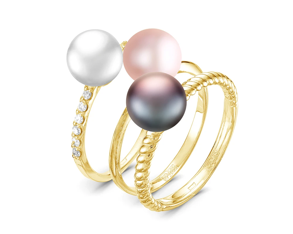 Оригинальный комплект состоит из трех колец, украшенных пресноводными жемчужинами. Качество жемчужин высокое, блеск очень яркий, форма идеальная круглая, дефектов на поверхности нет. Производство — Россия. Желтое золотое покрытие.