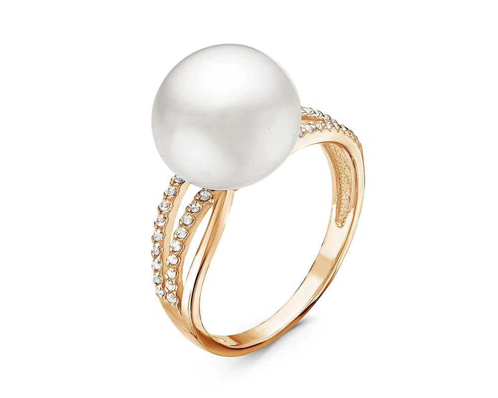 Кольцо выполнено из серебра 925 пробы с красным золотым покрытием, украшено белой пресноводной жемчужиной в форме пуговица (сплющенная).