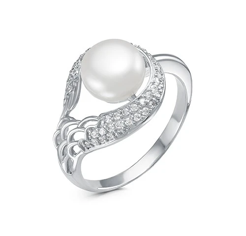 Кольцо выполнено из серебра 925 пробы, украшено фианитами и белой пресноводной жемчужиной формы пуговица (сплющенная). Высота кольца - 1,3 см.