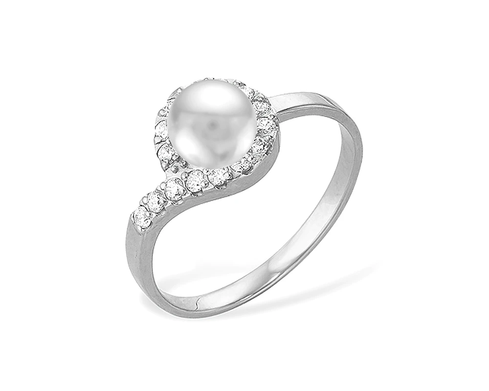 Кольцо выполнено из серебра 925 пробы, украшено фианитами и белой пресноводной жемчужиной сплющенной формы.