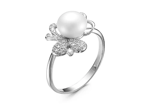 Кольцо выполнено из серебра 925 пробы, украшено фианитами и белой пресноводной жемчужиной сплющенной формы.
