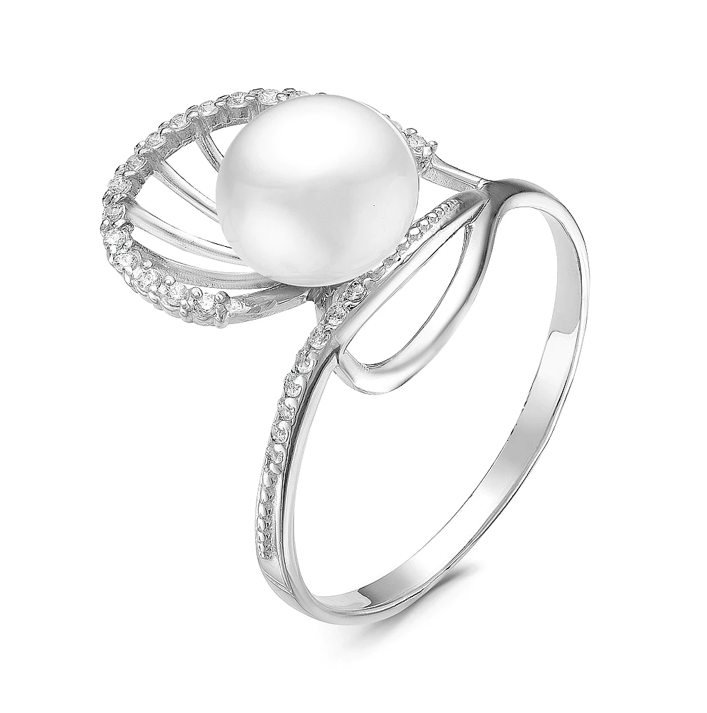 Кольцо выполнено из серебра 925 пробы, украшено фианитами и белой пресноводной жемчужиной формы пуговица (сплющенная).