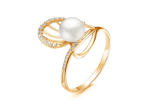 Кольцо выполнено из серебра 925 пробы с желтым золотым покрытием, украшено белой пресноводной жемчужиной в форме пуговица.