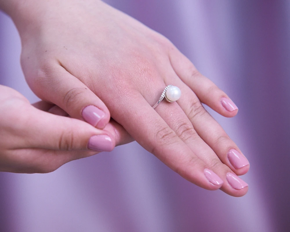 Кольцо выполнено из серебра 925 пробы, украшено белой пресноводной жемчужиной. Качество жемчужины высокое, блеск очень яркий, форма идеальная круглая, дефектов на поверхности нет. Производство — Россия.