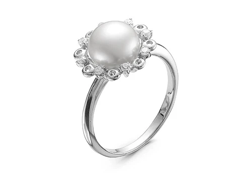 Кольцо выполнено из серебра 925 пробы, украшено фианитами и белой пресноводной жемчужиной сплющенной формы.