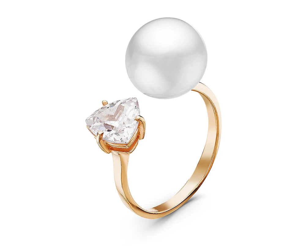 Кольцо выполнено из серебра 925 пробы с красным золотым покрытием, украшено фианитом и белой пресноводной жемчужиной в форме пуговица (сплющенная). Размер кольца — универсальный.
