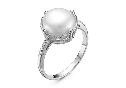 Кольцо выполнено из серебра 925 пробы, украшено фианитами и белой пресноводной жемчужиной сплющенной формы.