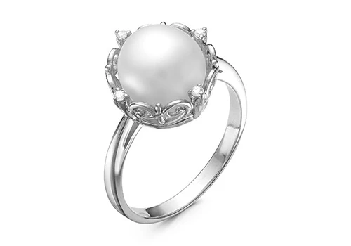 Кольцо выполнено из серебра 925 пробы, украшено фианитами и белой пресноводной жемчужиной сплющенной формы.