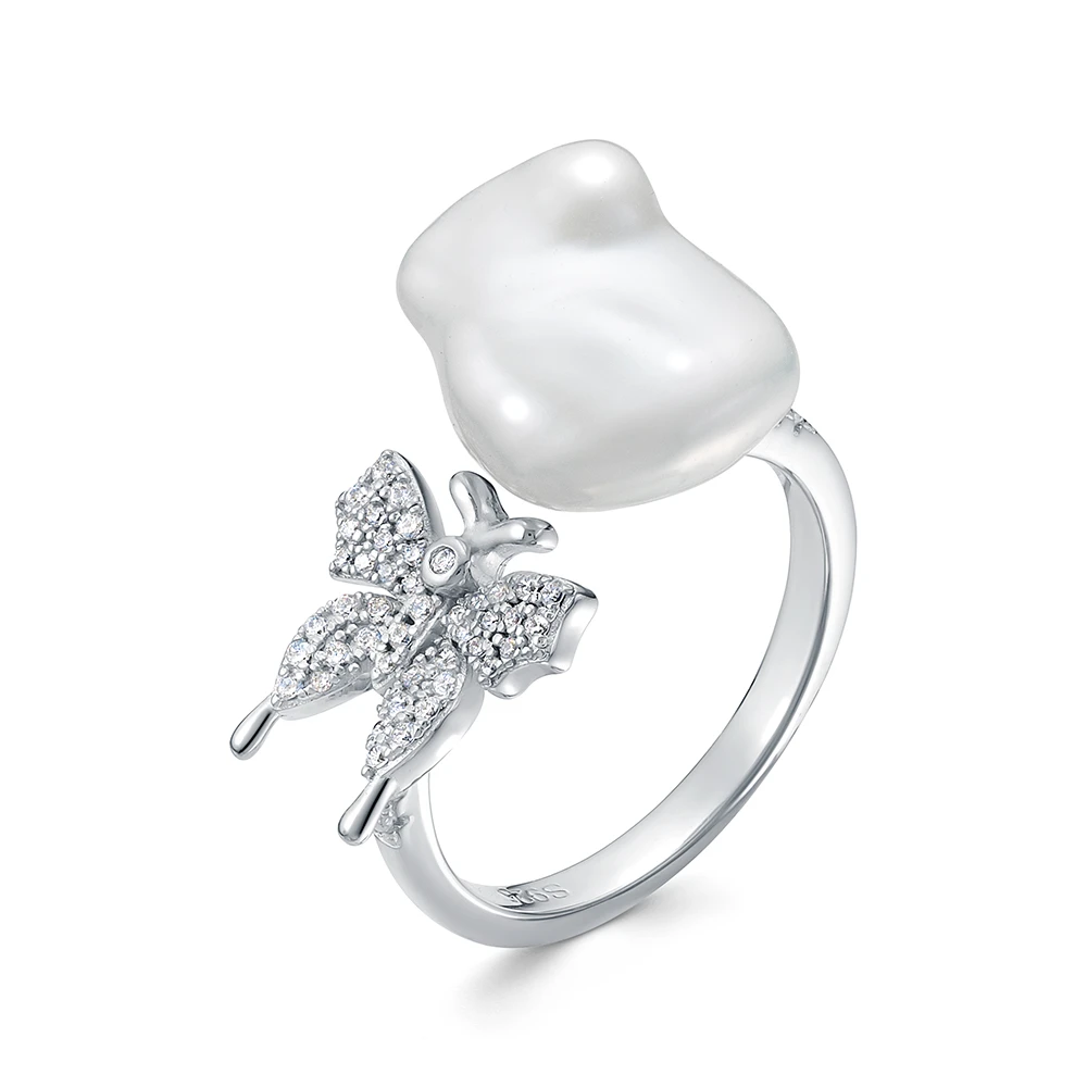 Кольцо выполнено из серебра 925 пробы, украшено барочной жемчужиной и фианитами. Размер кольца - универсальный.