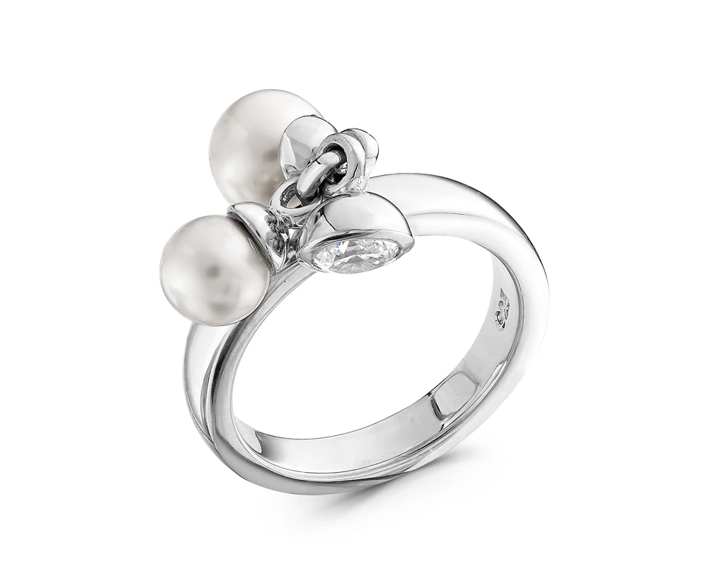 Кольцо выполнено из серебра 925 пробы, украшено белыми пресноводными жемчужинами круглой формы.