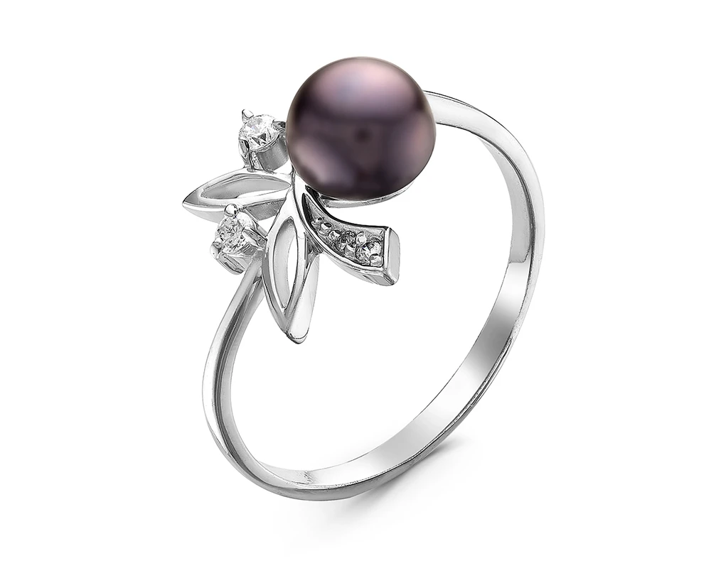 Кольцо выполнено из серебра 925 пробы, украшено фианитами и черной пресноводной жемчужиной в форме пуговица (сплющенная). В кольцах могут быть установлены жемчужины различных оттенков черного цвета.