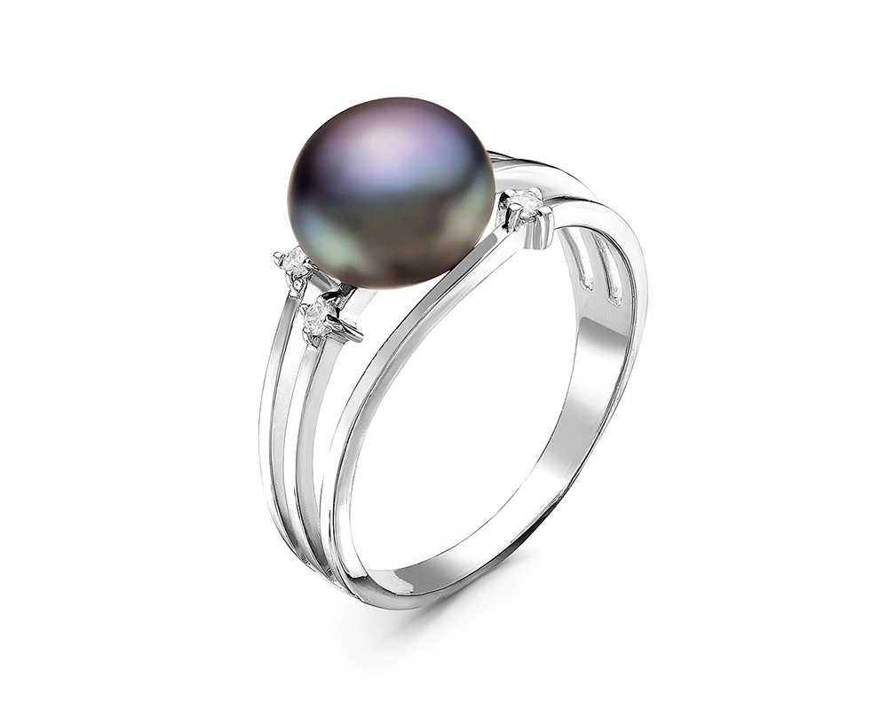 Кольцо выполнено из серебра 925 пробы, украшено фианитами и черной пресноводной жемчужиной в форме пуговица (сплющенная). В кольцах могут быть установлены жемчужины различных оттенков черного цвета.