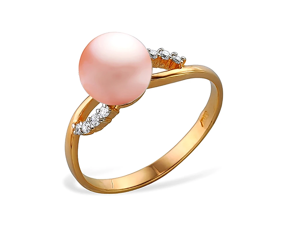 Кольцо выполнено из серебра 925 пробы с золотым покрытием, украшено фианитами и розовой пресноводной жемчужиной.