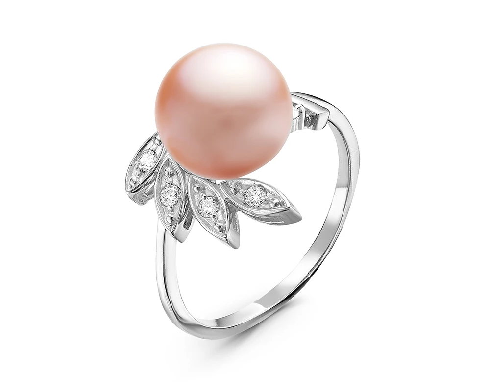 Кольцо выполнено из серебра 925 пробы, украшено фианитами и розовой пресноводной жемчужиной сплющенной формы. В кольцах могут быть установлены жемчужины розового цвета с разными оттенками.