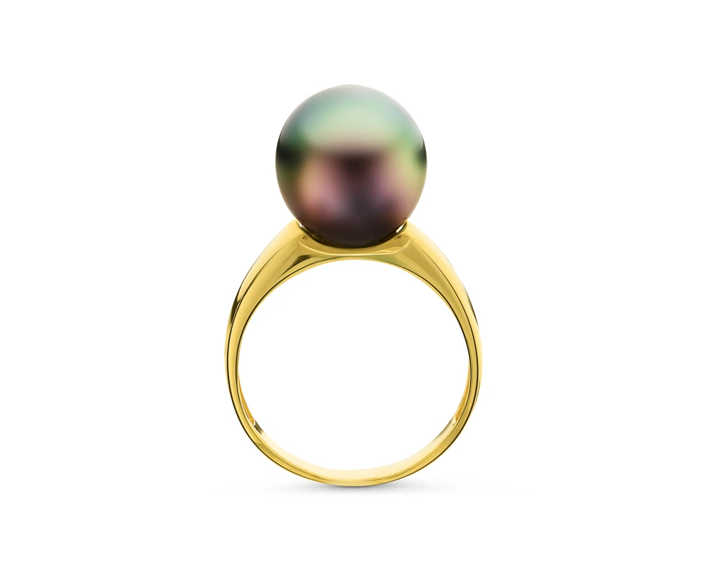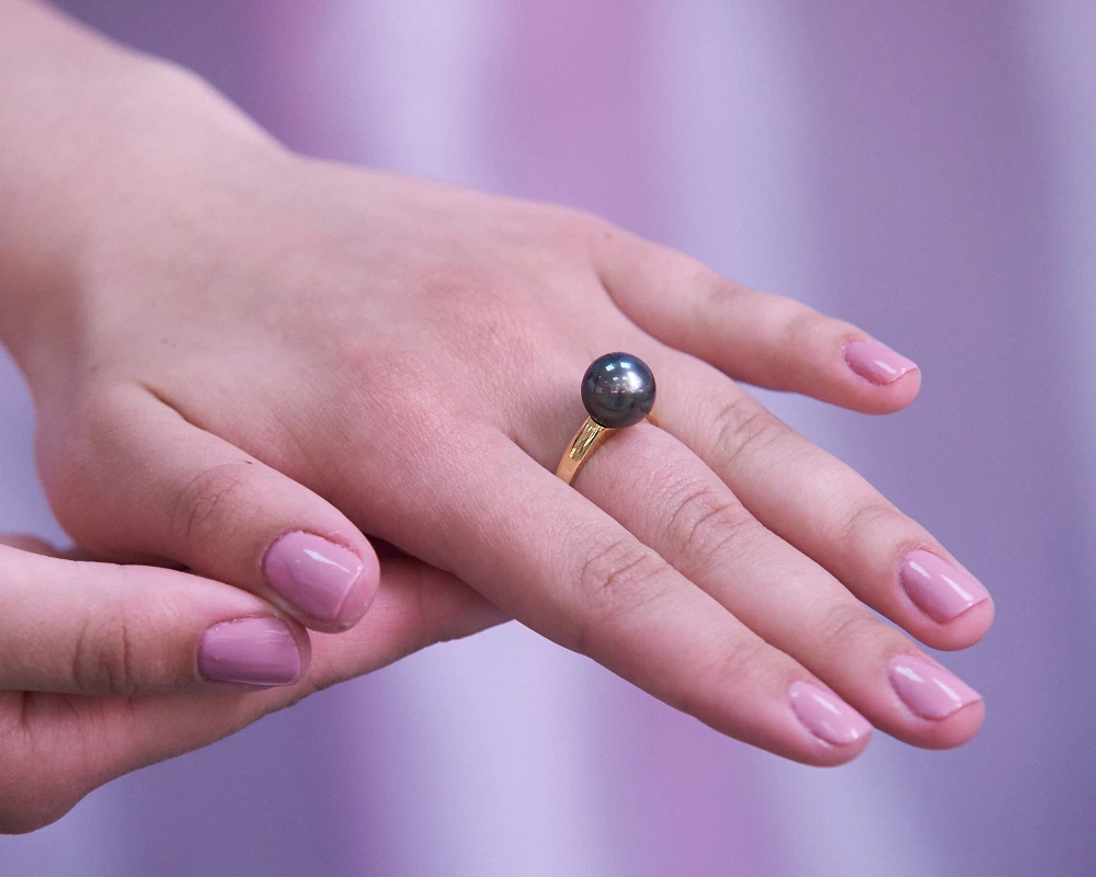 Кольцо из серебра 925 пробы с желтым золотым покрытием украшено морской черной Таитянской жемчужиной. Качество жемчужины наивысшее, яркий перламутровый блеск и идеальная ровная поверхность жемчужин.