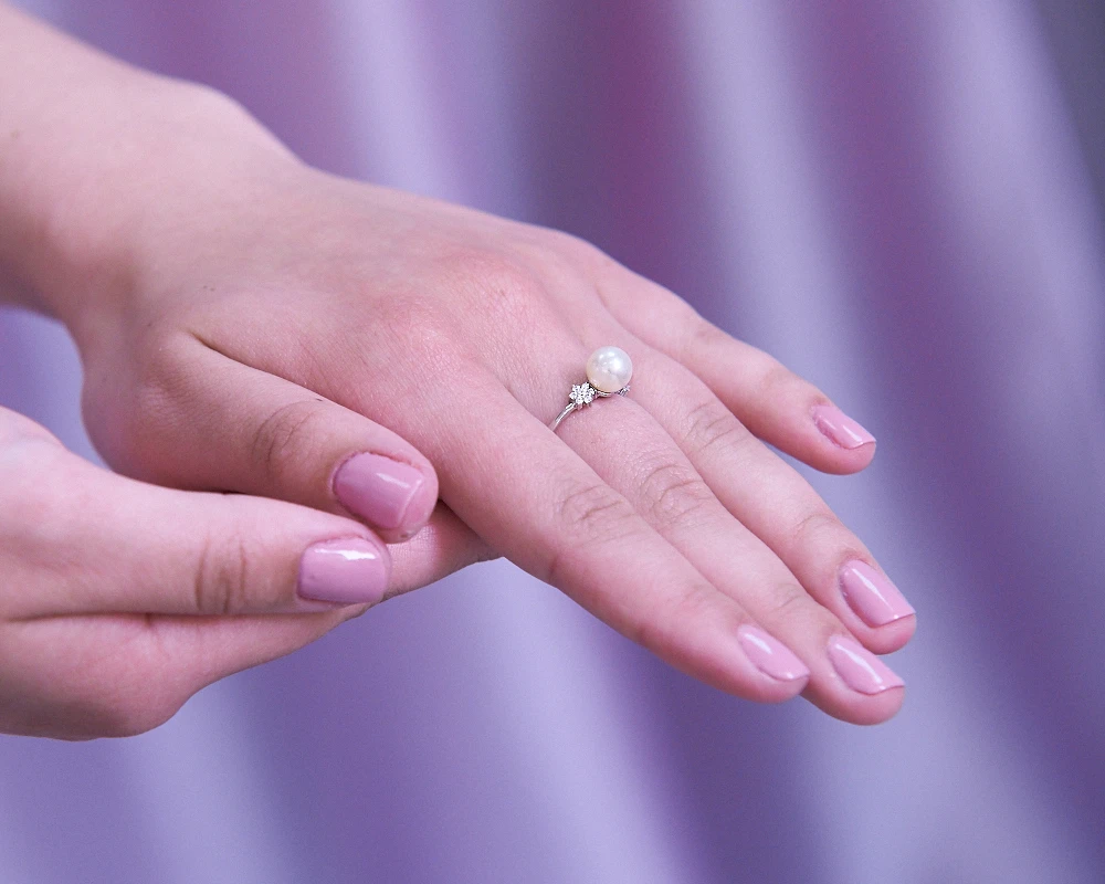 Кольцо выполнено из золота 585 пробы и украшено идеально круглой белой жемчужиной пресной воды. Качество жемчужины наивысшее для пресноводного жемчуга, блеск очень яркий, поверхность без дефектов. Производство — Россия.
