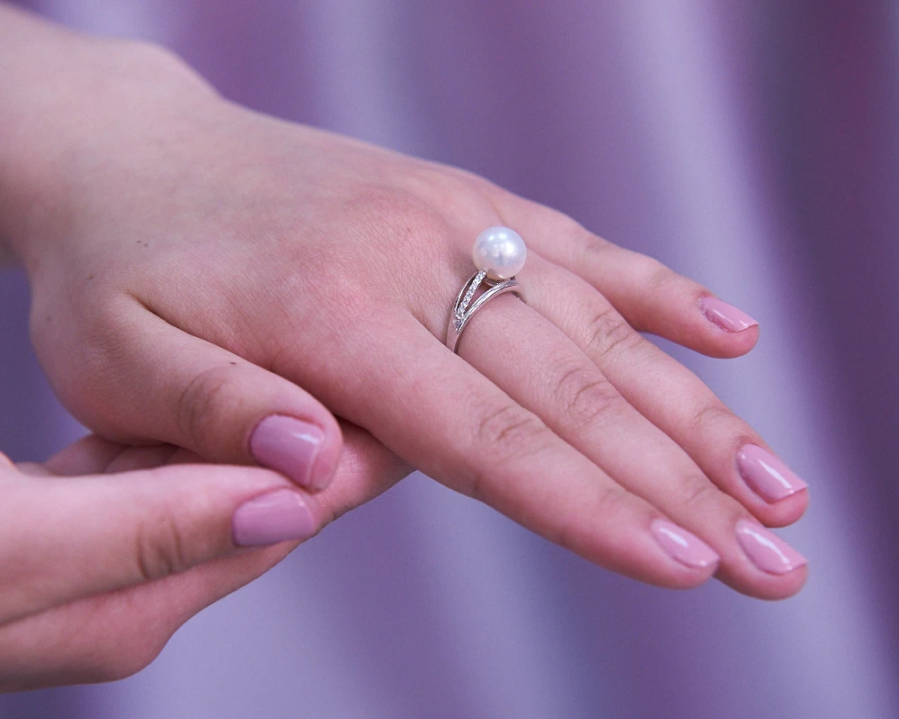 Кольцо выполнено из золота 585 пробы и украшено идеально круглой белой жемчужиной пресной воды. Качество жемчужины очень высокое, блеск яркий, поверхность без дефектов, форма жемчужины идеально сферическая. Производство — Россия.