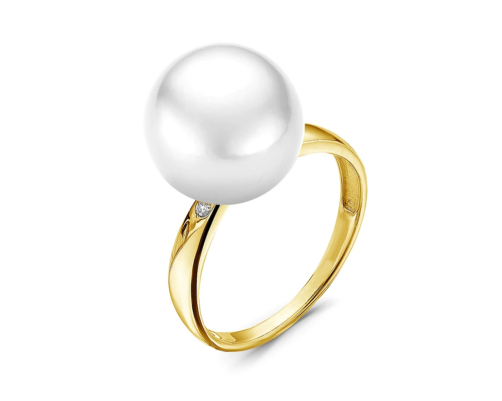 Кольцо из желтого золота 585 пробы украшено бриллиантами и морской Австралийской жемчужиной. Качество жемчужины наивысшее: форма идеальная круглая, яркий перламутровый блеск и идеальная ровная поверхность. Кольцо изготовлено российскими ювелирами, изделие эксклюзивное.