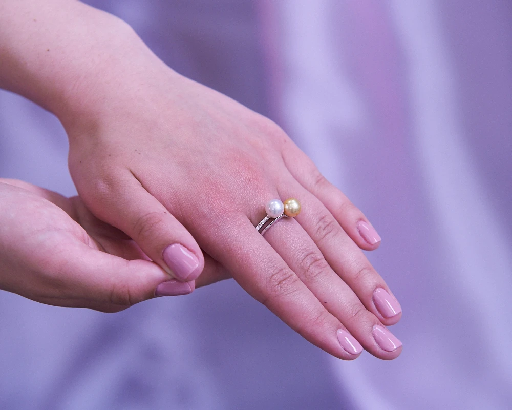 Двойное кольцо «Дуэт» из белого золота 585 пробы украшено японскими морскими жемчужинами Акойя и бриллиантами. Качество жемчужин наивысшее: форма идеальная круглая, яркий перламутровый блеск и идеальная ровная поверхность жемчужин. Кольцо изготовлено российскими ювелирами, изделие эксклюзивное.