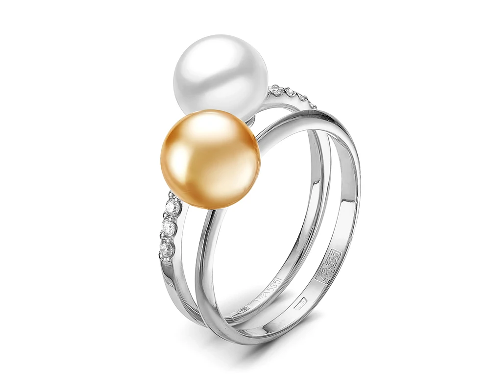 Кольцо "Дуэт" из белого золота с белой и золотой жемчужинами Акойя 7,5-8 мм, (4132)