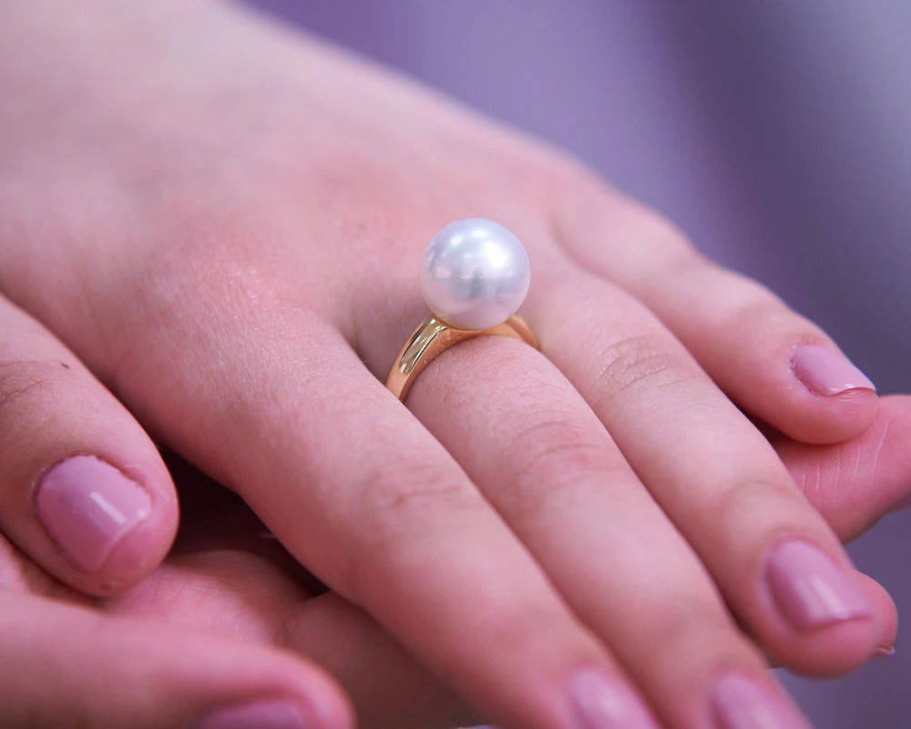 Кольцо из желтого золота 585 пробы украшено морской Австралийской жемчужиной. Качество жемчужины наивысшее: форма идеальная круглая, яркий перламутровый блеск и идеальная ровная поверхность. Кольцо изготовлено российскими ювелирами, изделие эксклюзивное.