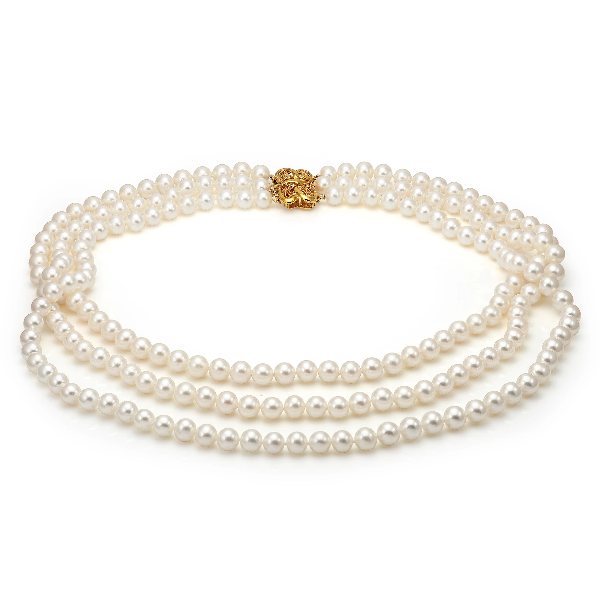 Трехрядное ожерелье собрано из отборных пресноводных жемчужин белого цвета.
