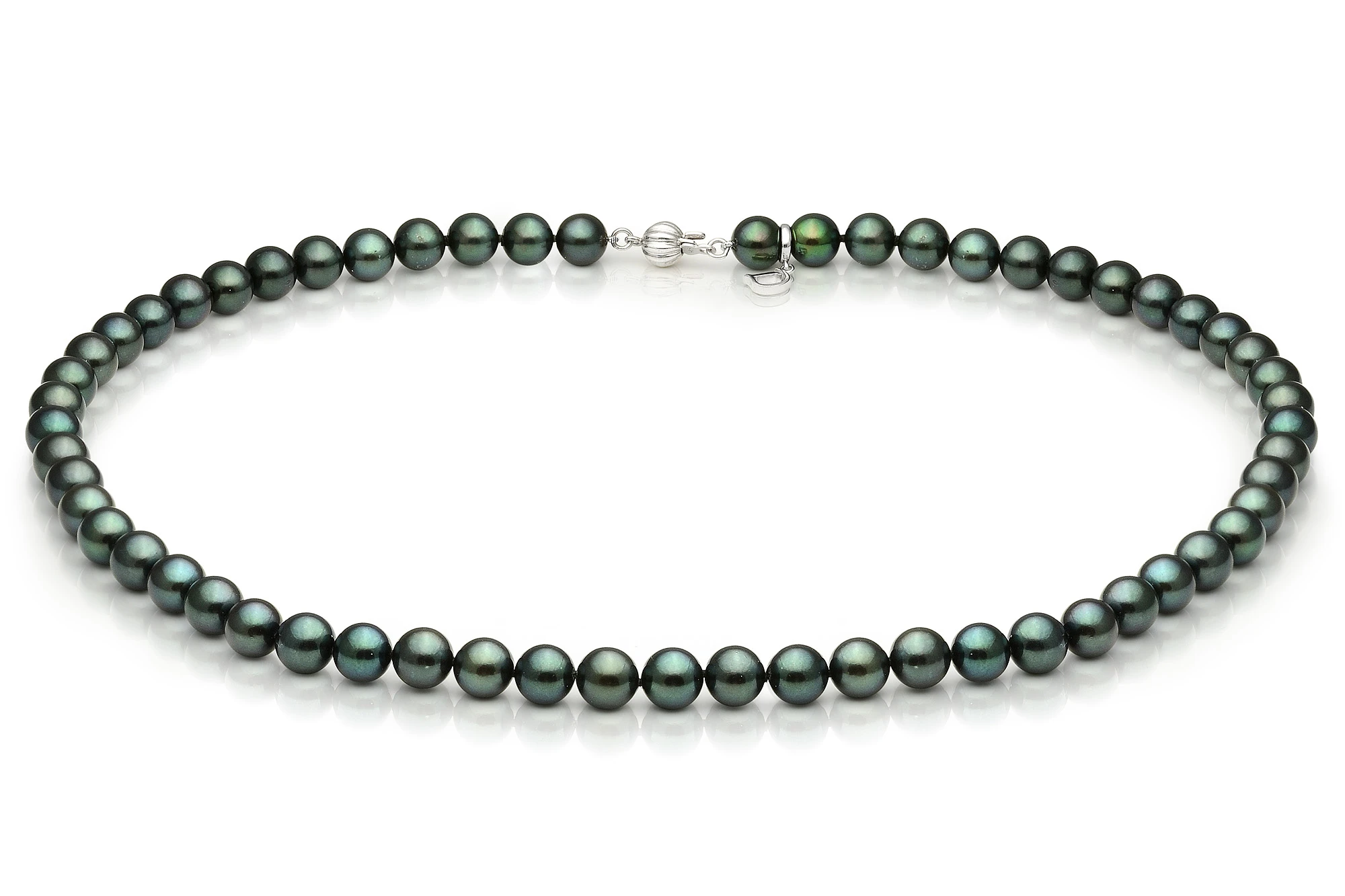 Классическое ожерелье собрано из натуральных морских жемчужин черного цвета, рожденных в теплых водах океана у берегов Японии. Данный вид жемчуга называется Акойя (Akoya) и считается самым ярким жемчугом в мире. Все жемчужины в колье имеют идеальную сферическую форму и ровную, гладкую поверхность с минимальным количеством дефектов. Качество жемчуга очень высокое.