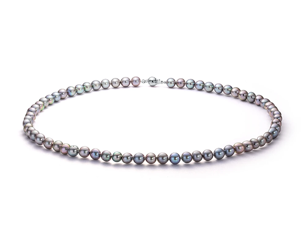 Классическое ожерелье собрано из натуральных морских жемчужин темно-серебристого цвета, рожденных в теплых водах океана у берегов Японии. Данный вид жемчуга называется Акойя (Akoya) и считается самым ярким жемчугом в мире. Все жемчужины в колье имеют идеальную сферическую форму и ровную, гладкую поверхность с небольшим количеством дефектов.